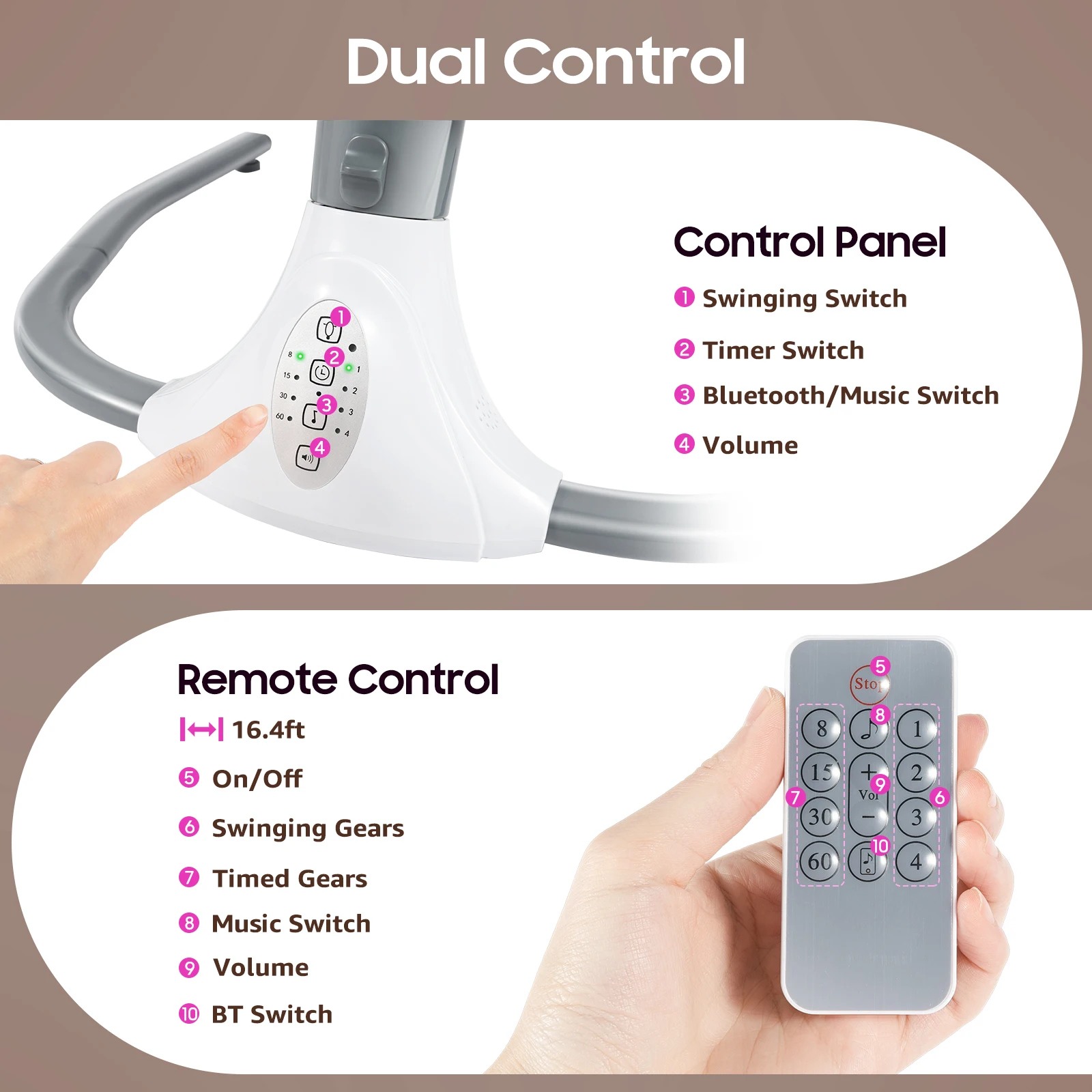 Dual Control: You can directly press the buttons on the baby swing to set the time/gear/music, or set them through the remote control within a 16.4ft range.Dual Control: You can directly press the buttons on the baby swing to set the time/gear/music, or set them through the remote control within a 16.4ft range.