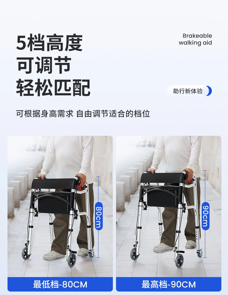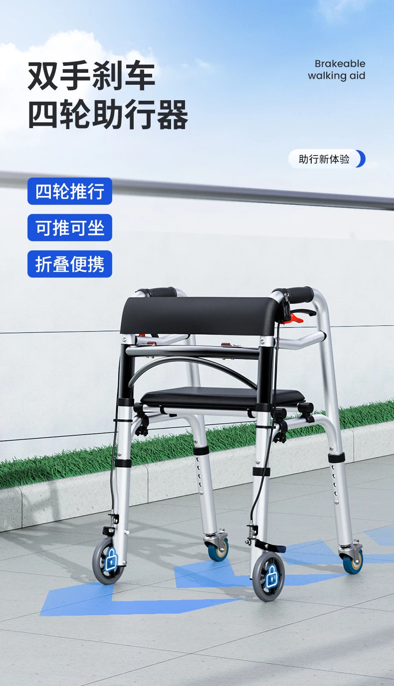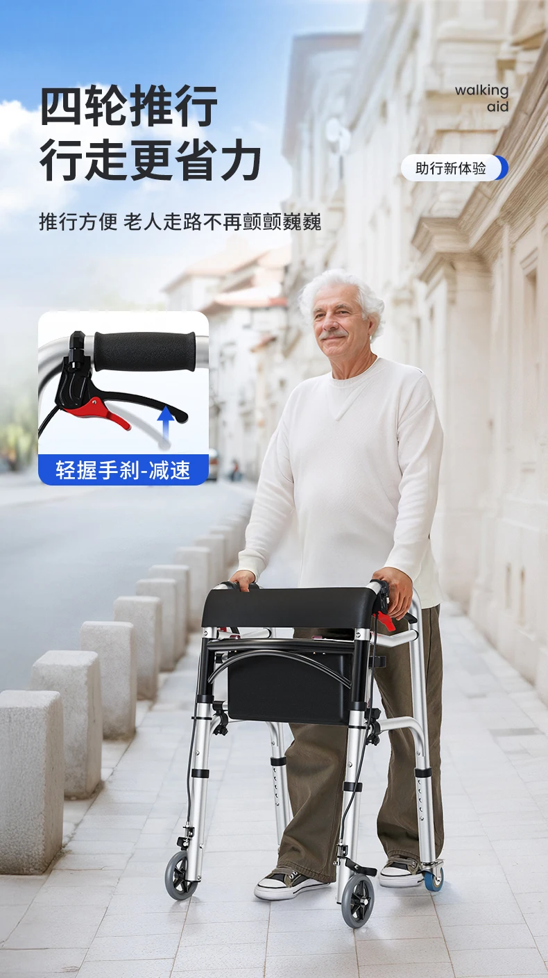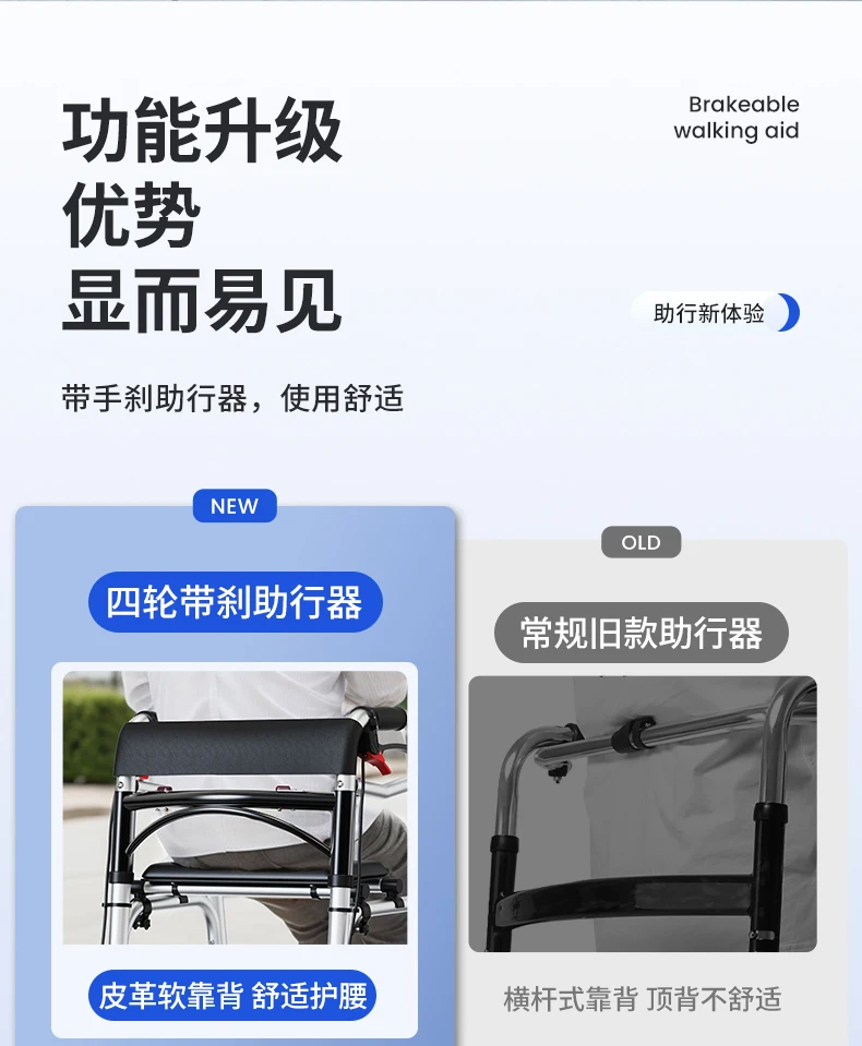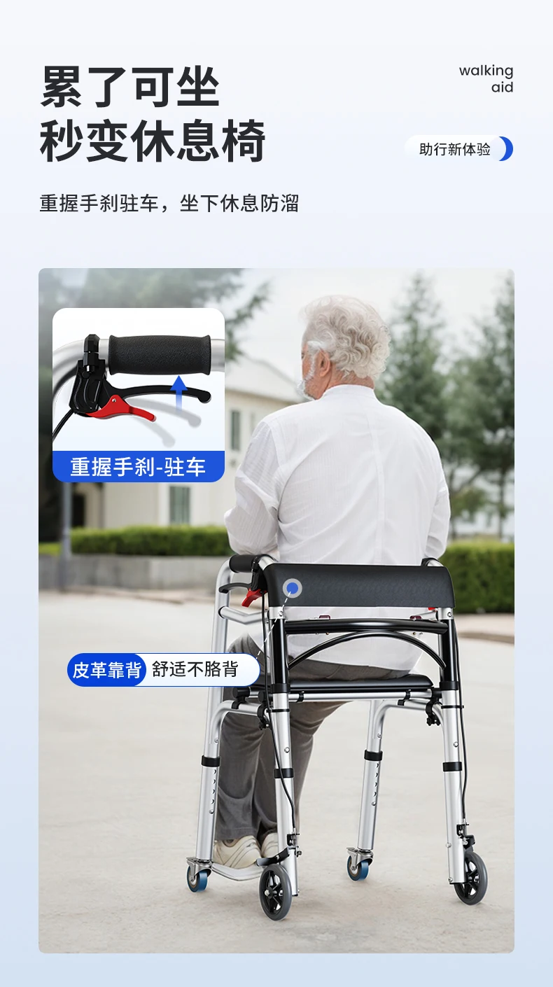 Elderly Rollator Walker with Seat Foldable Mobility Aid for Seniors Leather Backrest Four Wheels Easy to Push and Sit Stable