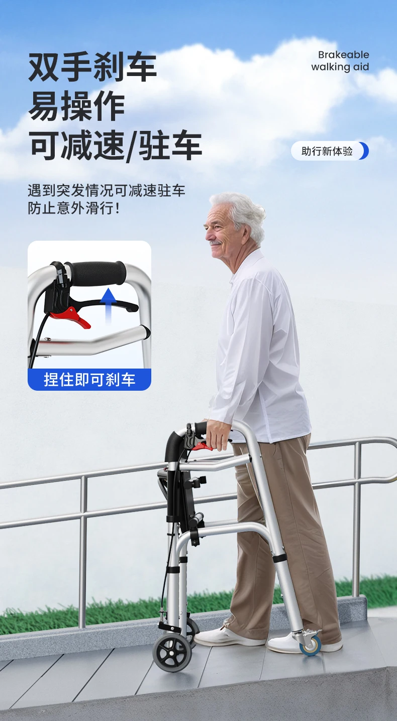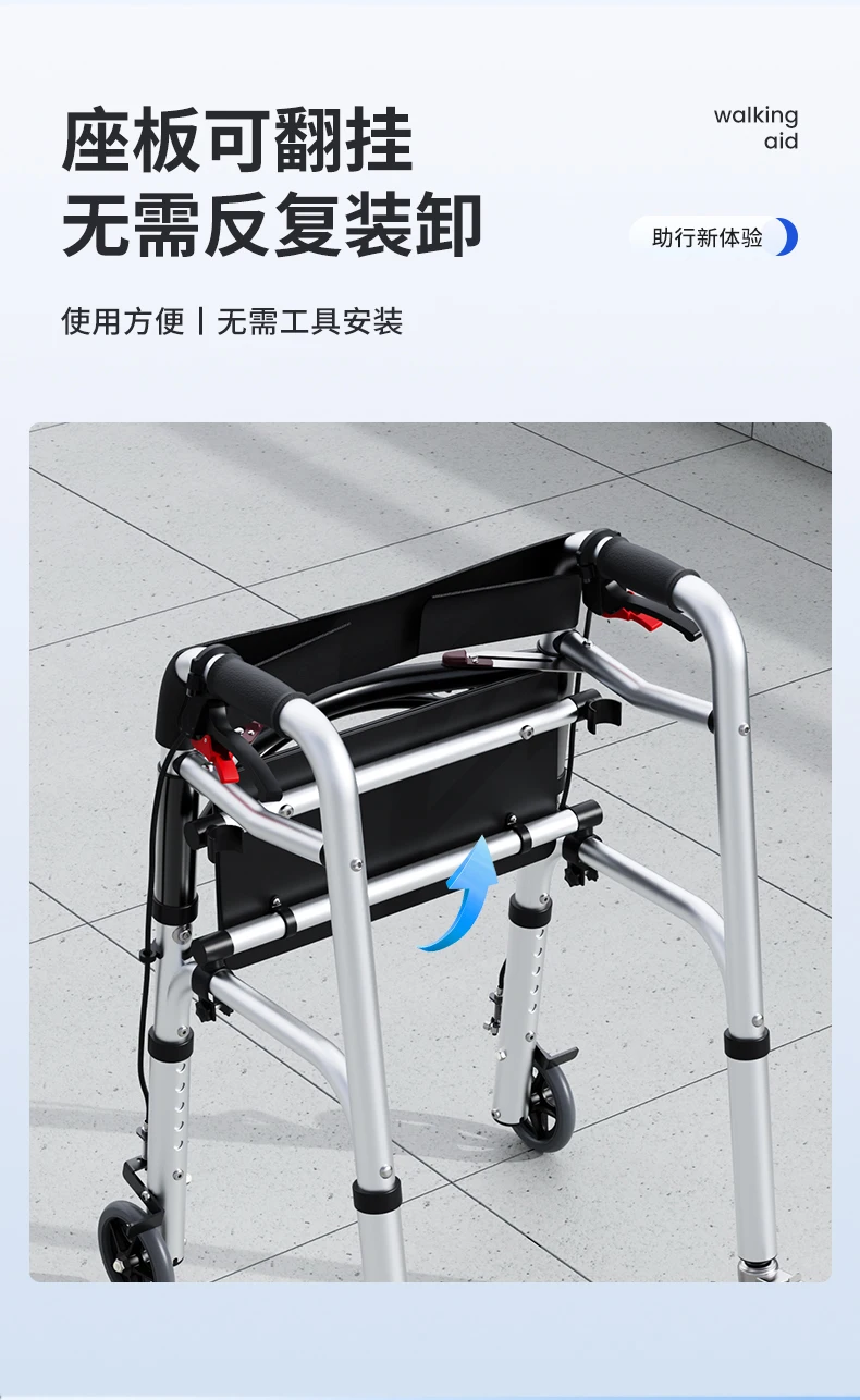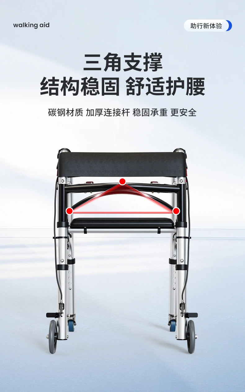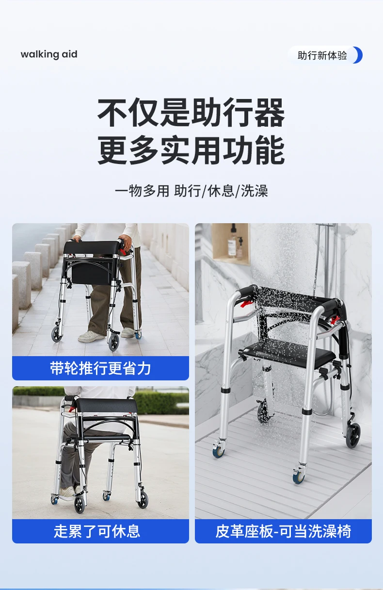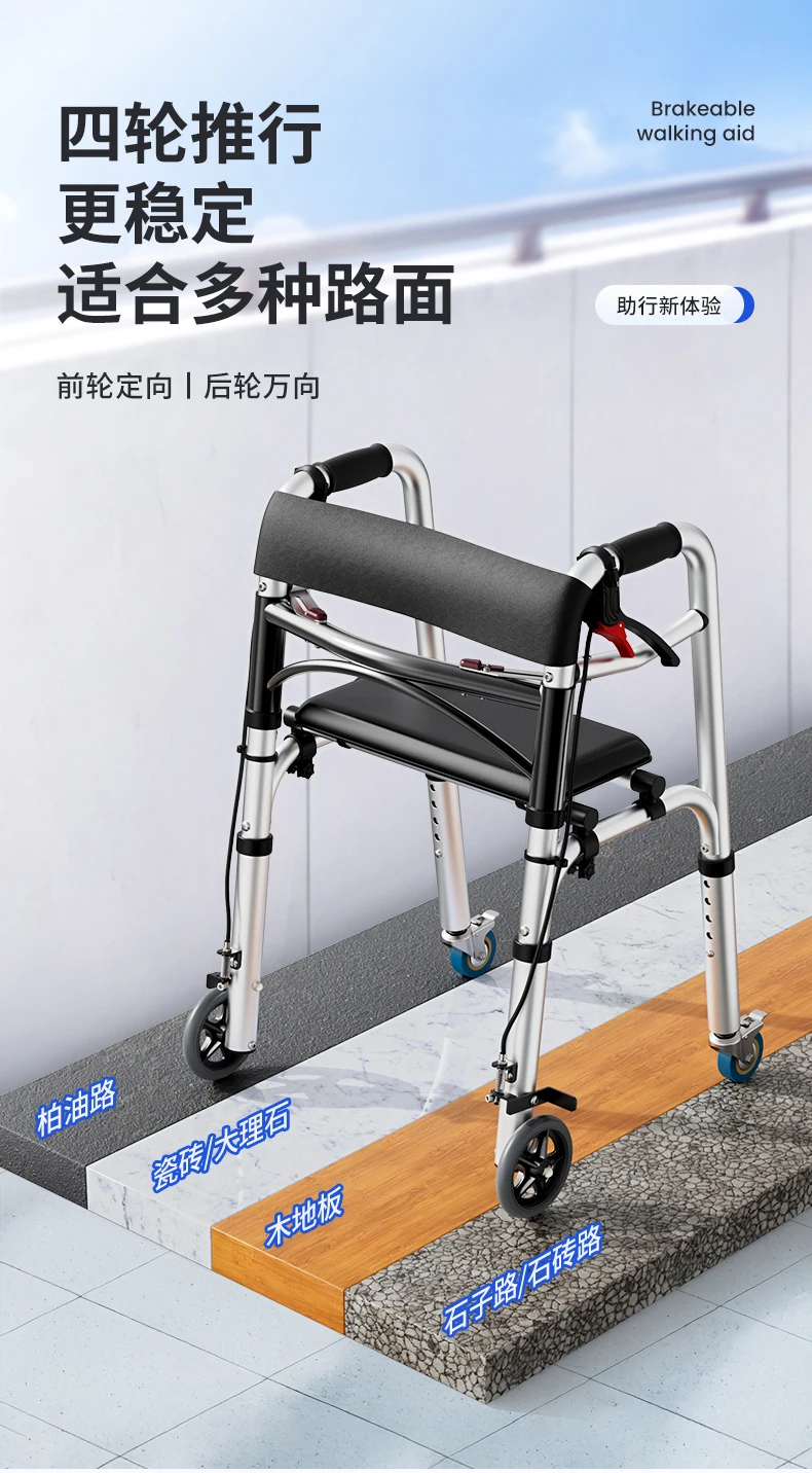Elderly Rollator Walker with Seat Foldable Mobility Aid for Seniors Leather Backrest Four Wheels Easy to Push and Sit Stable